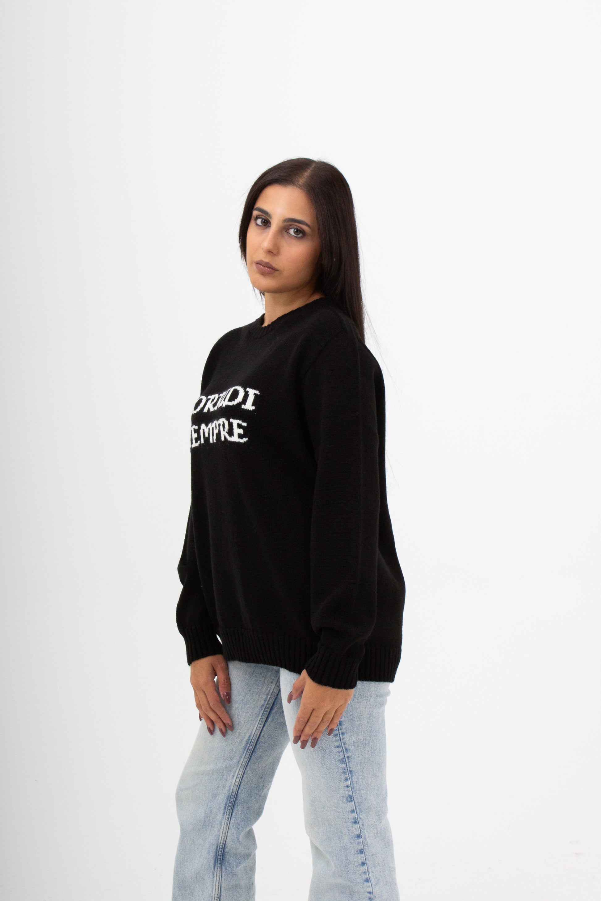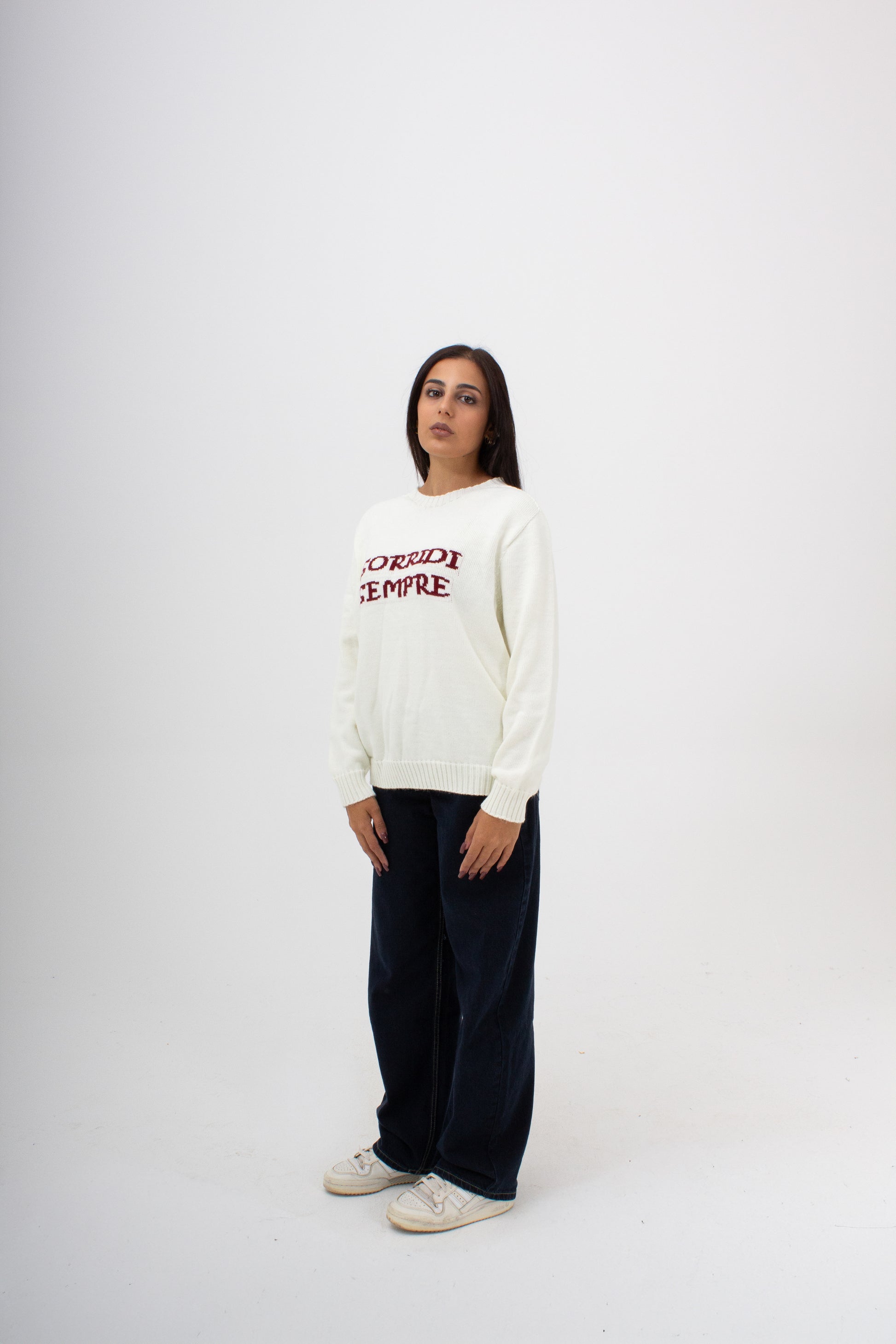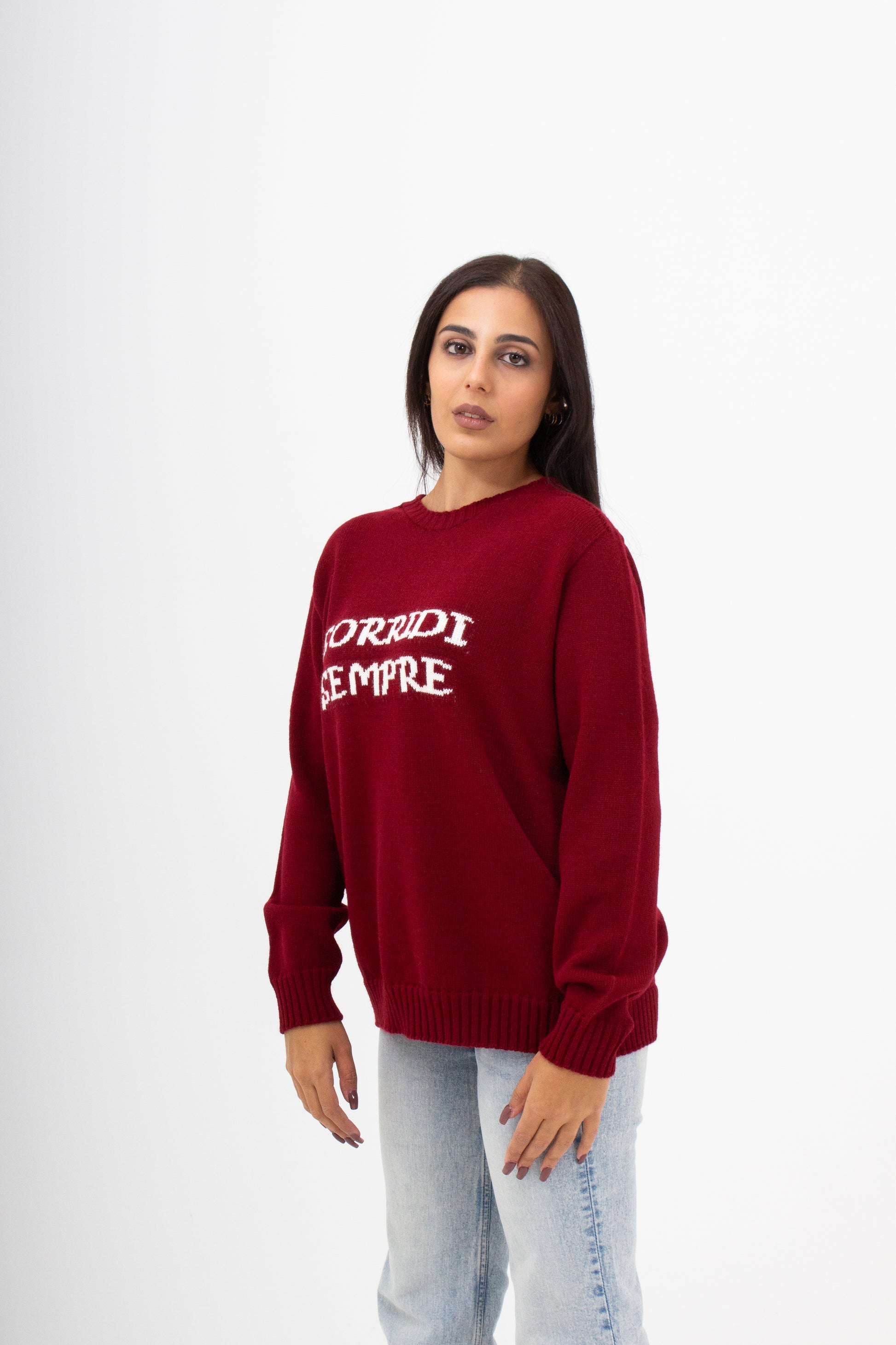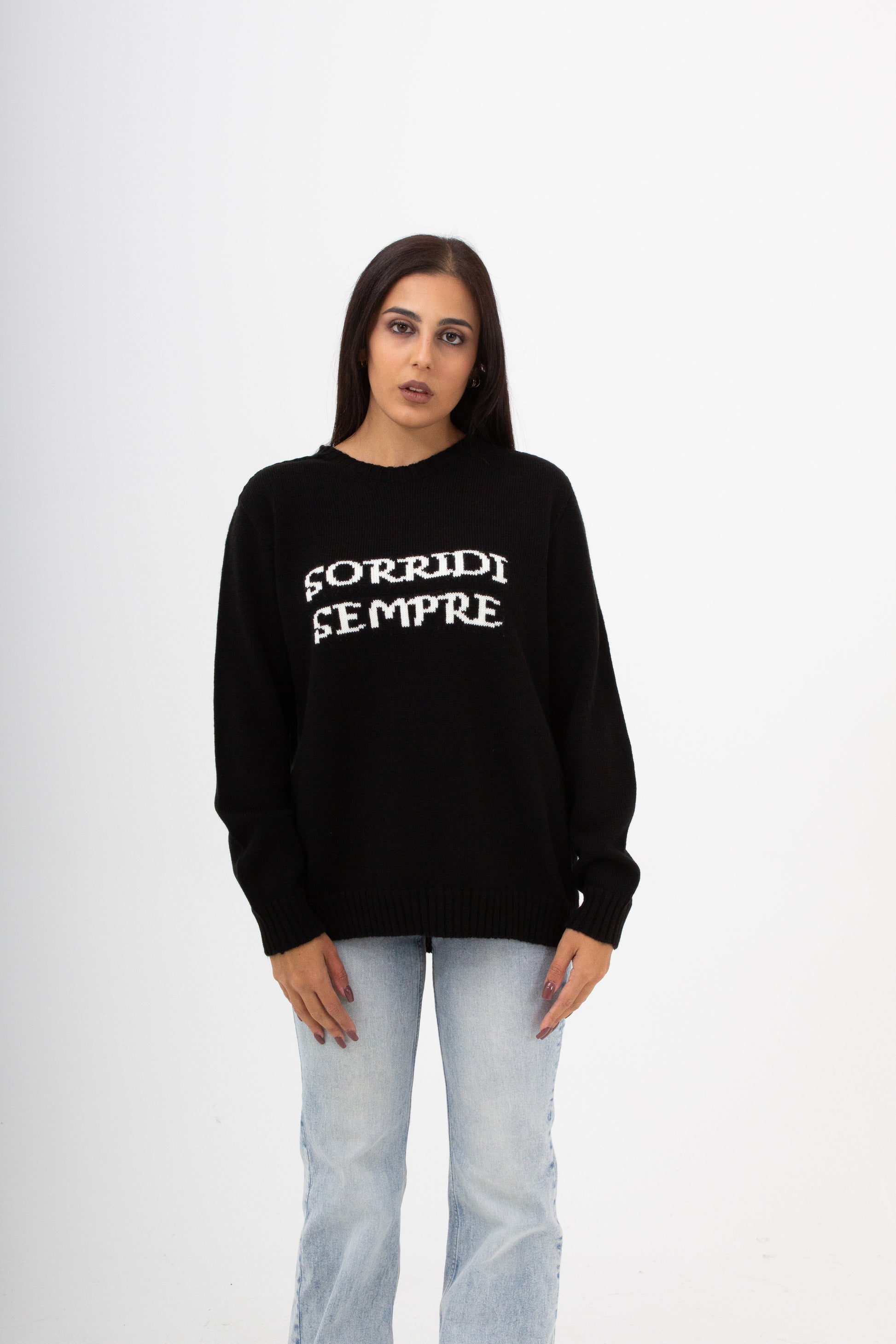 Maglieria made in italy 50% Lana 50% Acrilico , con scritta ad intarsio . Vestibilità comoda dalla XS ALLA 4XL.